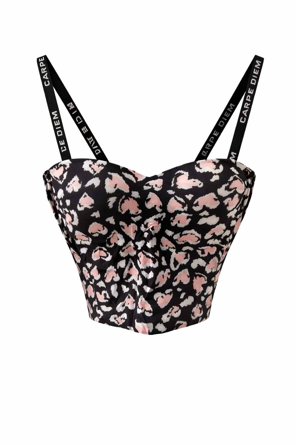 Top dal design femminile e contemporaneo, caratterizzato da una silhouette strutturata che valorizza la figura. Realizzato in tessuto leggero con stampa animalier nei toni soft (oppure nero con dettagli a contrasto)e bretelle con scritta carpe diem, presenta coppe sagomate e linea aderente.